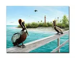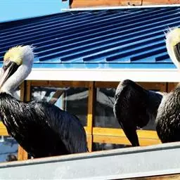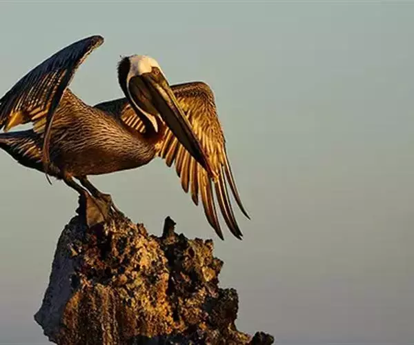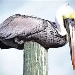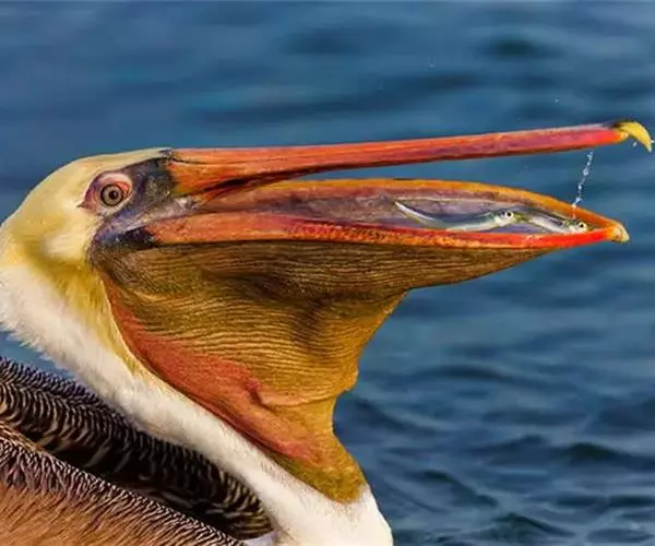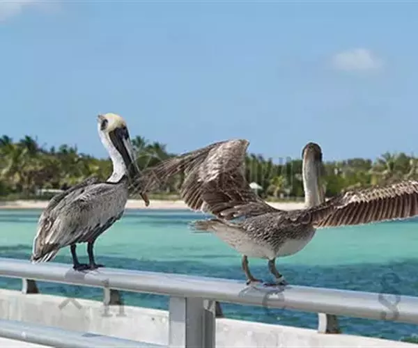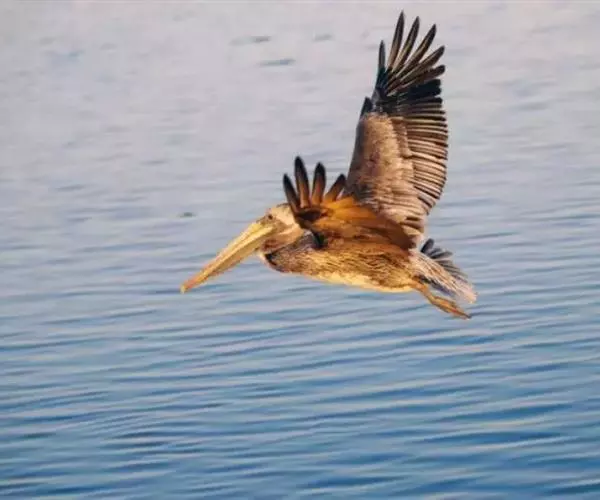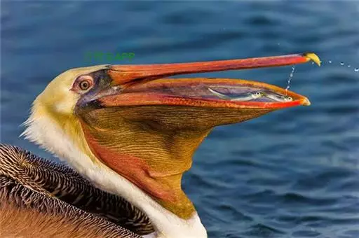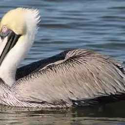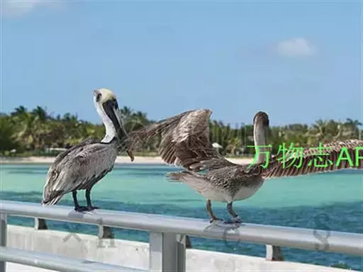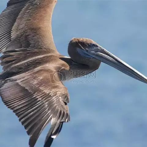 褐鹈鹕(学名:Pelecanus occidentalis):是鹈鹕家族中体型最小的成员。体型粗大,体重6.5-9千克。嘴形宽大直长,上嘴尖端朝下弯曲,呈钩状;下嘴分左右二支,其间有一巨大而能扩缩的皮肤喉囊;鼻孔小,而位于嘴基。眼前部裸出。颈长而较细小。翅宽阔,但形不长也不尖;尾短而呈方形;跗蹠短而扁平,前面呈网眼状细鳞。