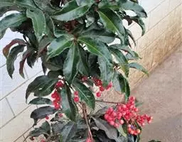 百两金(学名:Ardisia crispa (Thunb.) A. DC.)是紫金牛科,紫金牛属灌木,高可达100厘米,具匍匐生根的根茎,花枝多,叶片膜质或近坚纸质,椭圆状披针形或狭长圆状披针形,顶端长渐尖,稀急尖,基部楔形,两面无毛,背面多少具细鳞片,边缘脉不明显;亚伞形花序,花梗被微柔毛;花萼仅基部连合,萼片长圆状卵形或披针形,花瓣白色或粉红色,卵形,子房卵珠形,无毛;果球形,鲜红色,5-6月开花,10-12月结果,有时植株上部开花,下部果熟。