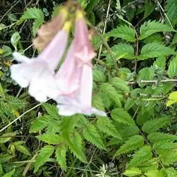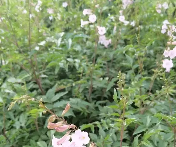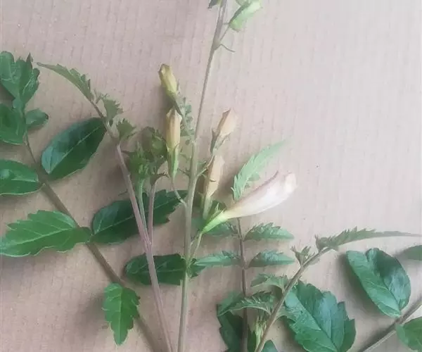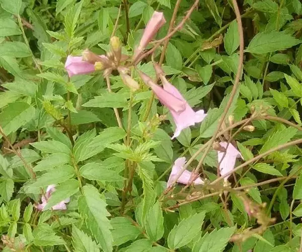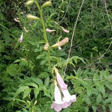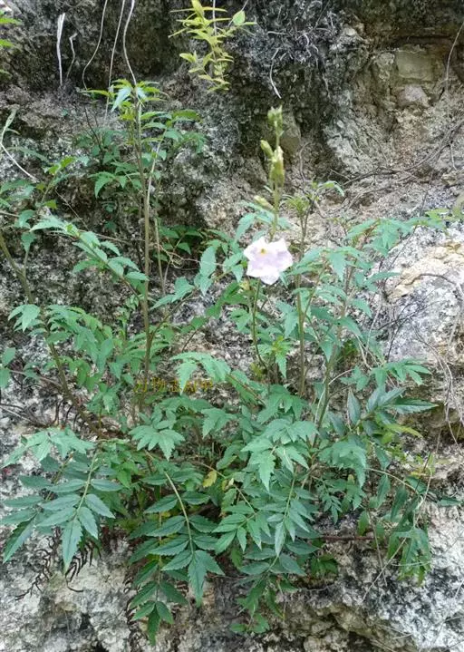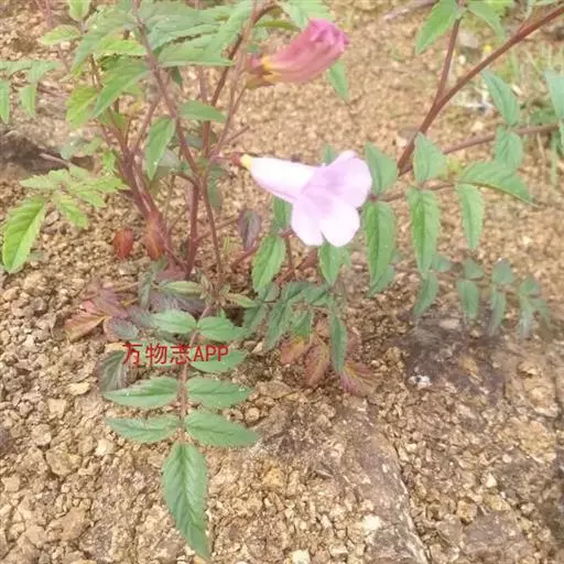 多年生具茎草本,分枝,高达1.5米。叶互生,为1回羽状复叶,不聚生于茎基部,长约15厘米;小叶5-11枚,卵状披针形长3-5厘米,宽15-20毫米,顶端长渐尖,基部阔楔形,两侧不等大,边缘具锯齿,上面深绿色,疏被微硬毛,下面淡绿色,无毛。顶生总状花序,有花6-20朵;苞片钻形,长3毫米,小苞片2,长不足1.5毫米;花梗长0.8-2.5厘米。花萼钟状,长5-8毫米,萼齿5,钻形,长1-4毫米,基部近三角形。花冠淡红色、紫红色或粉红色,钟状长漏斗形,长约4厘米,直径约2厘米;花冠筒基部紧缩成细筒,裂片半圆形,长约1厘米,宽约1.4厘米。雄蕊4,2强,着生于花冠筒近基部,长1.8-2.2厘米,不外伸;花药成对连着,丁字形着生。花柱细长,柱头舌状,极薄,2片裂,子房细圆柱形。果线状圆柱形,革质,长约20厘米。种子细小,多数,长椭圆形,两端尖,被丝状种毛。花期3-7月,果期9-12月。
