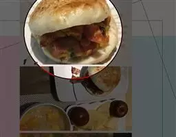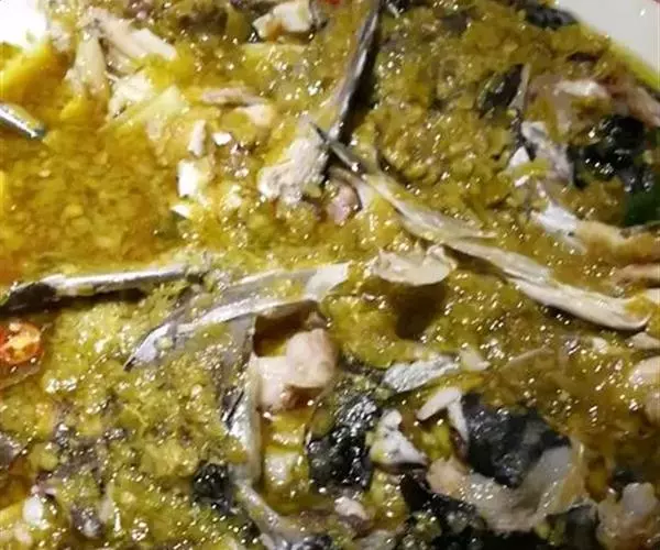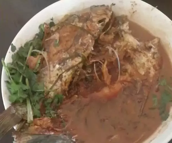 鱼头咸鲜微辣,嫩而香味浓郁,手工烙饼酥脆,蘸汤后松软可口。 此菜酱香浓郁,配带面饼,用汤汁泡食,一菜两吃。