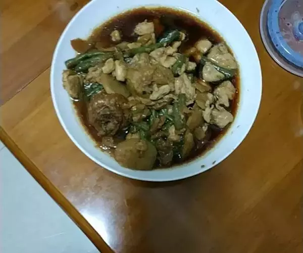 配料:香葱、干辣椒、葱、姜、蒜、生抽、老抽、番茄酱、盐、老汤、油各适量。