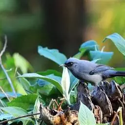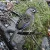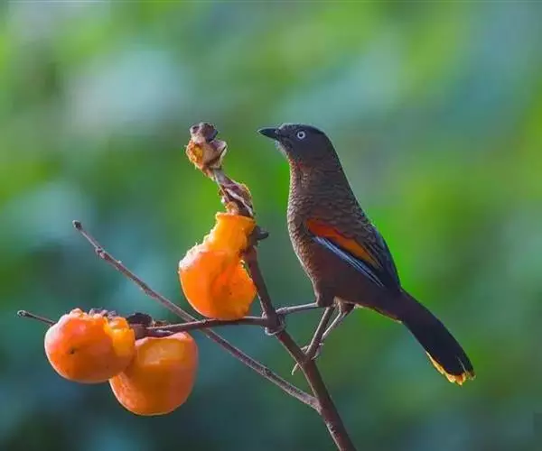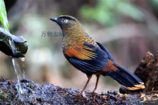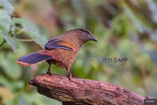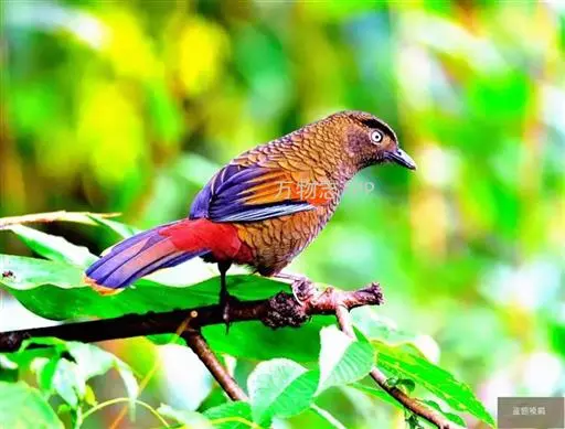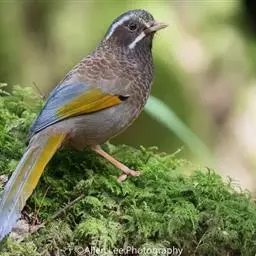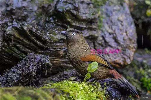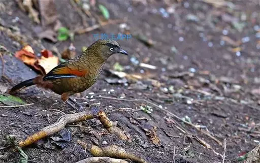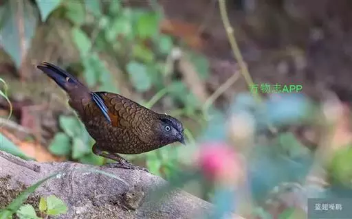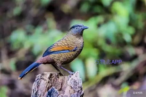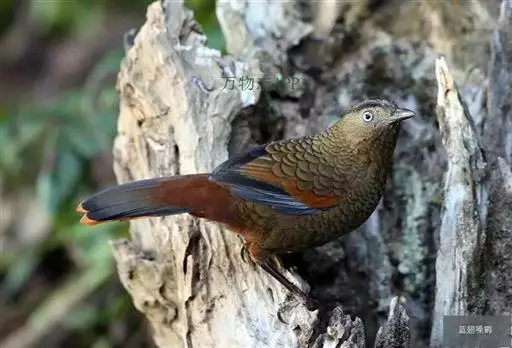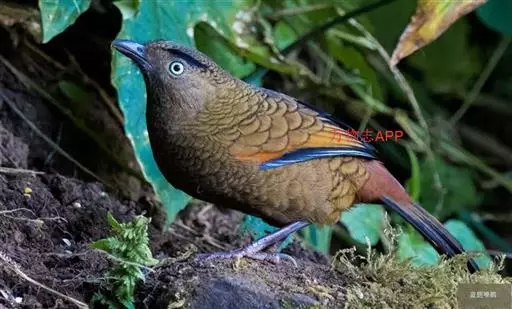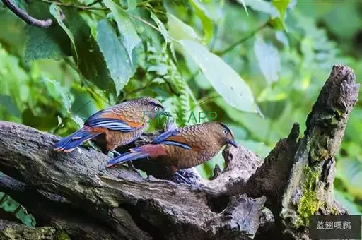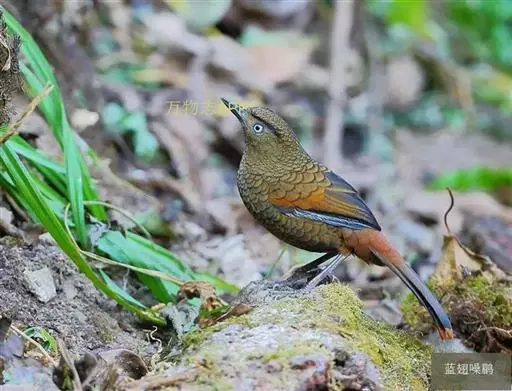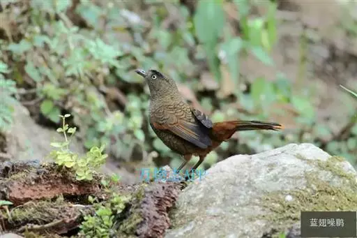 蓝翅噪鹛(学名:Garrulax squamatus):中型鸟类,体长22-25厘米。上体棕橄榄褐色密被黑色鳞状斑,眼蓝白色,眼上有一长而宽阔的黑色眉纹,从眼先直到颈侧。下体棕褐色被黑色鳞状斑;尾上和尾上覆羽栗色,尾黑色具棕色端斑;翅上覆羽栗色,初级覆羽灰黑色;飞羽黑褐色,外侧飞羽外翈蓝色,内侧飞羽基部亮栗色。