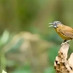 斑背噪鹛是噪眉科、噪鹛属中型鸟类,体长24-28厘米。额至头顶多为栗褐色,眼先、眼周和眼后纹均白色,…