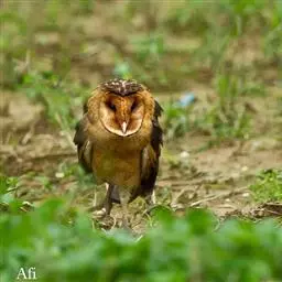 草鸮(学名:Tyto longimembris)是中等体型的鸮类,体长35厘米,夜行猛禽。面庞心形。似仓鸮,但脸及胸部的皮黄色色彩甚深,上体深褐。喙坚强而钩曲。嘴基蜡膜为硬须掩盖。翅的外形不一,第五枚次级飞羽缺。尾短圆,尾羽12枚,有时仅10枚。脚强健有力,常全部被羽,第四趾能向后反转,以利攀缘。爪大而锐。尾脂腺裸出。无副羽,间或留存。耳孔周缘具耳羽,有助于夜间分辨声响与夜间定位。营巢于树洞或岩隙中。雏鸟晚成性。