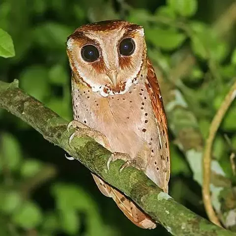 草鸮是中型猛禽。体长32厘米,翼展116厘米,体重450克。上体暗褐,具棕黄色斑纹,近羽端处有白色小斑点。似仓鸮,面盘灰棕色,呈心脏形,有暗栗色边缘。飞羽黄褐色,有暗褐色横斑;尾羽浅黄栗色,有四道暗褐色横斑;下体淡棕白色,具褐色斑点。嘴黄褐色。爪黑褐色。虹膜-褐色;嘴-米黄色;脚-略白。