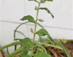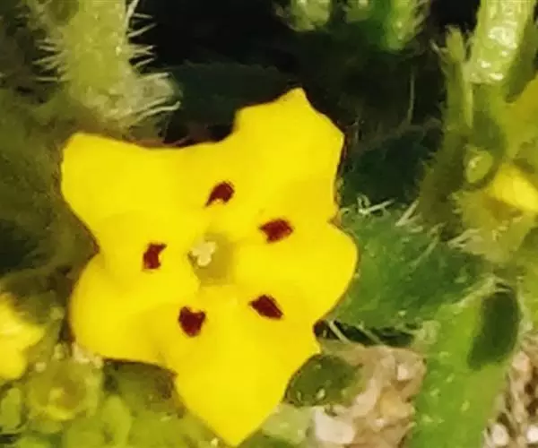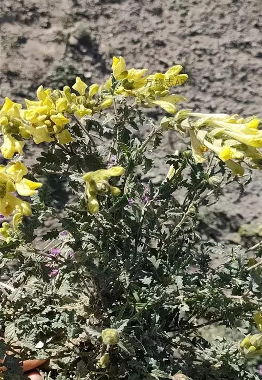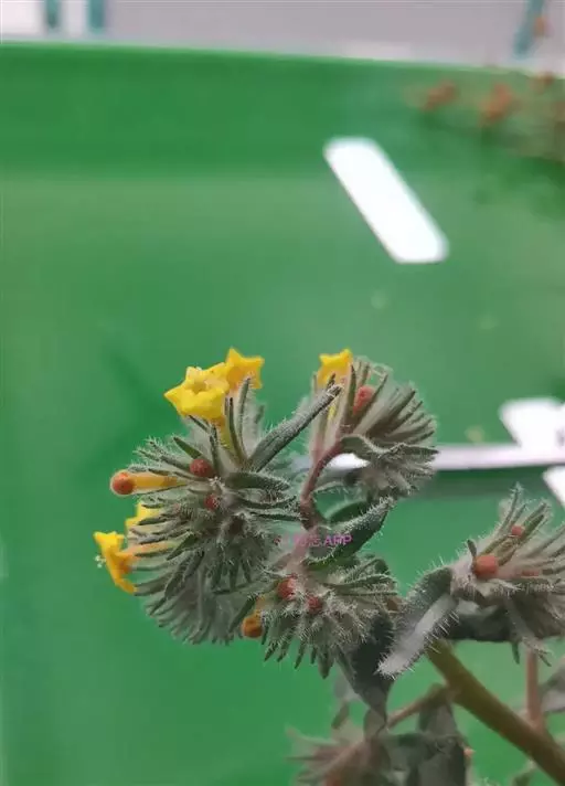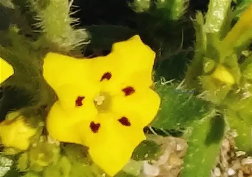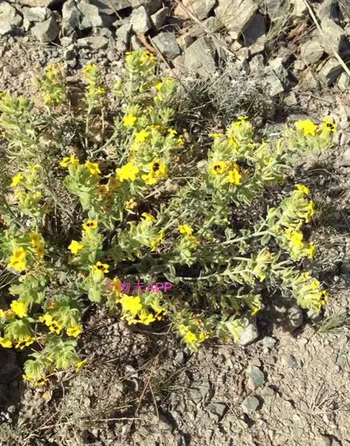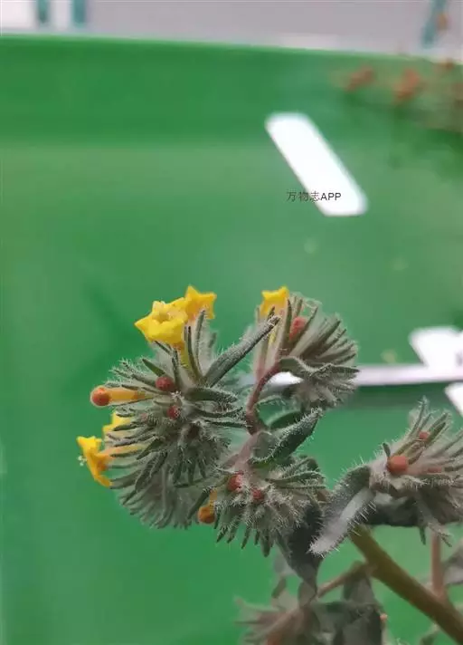 多年生草本。根稍含紫色物质。茎高20-30厘米,有疏分枝,密生灰白色短柔毛。叶 无叶柄,狭卵形至线状长圆形,长1-2厘米,宽2-6毫米,先端急尖,两 面都有短伏毛和具基盘的短硬毛,边缘具钝锯齿,齿端有硬毛。镰状聚伞花序长1.5-5厘米,有数朵花,排列较疏;苞片与叶同型。花萼长约1厘米,裂片线 形,两面密生长硬毛和短硬毛;花冠黄色,筒状钟形,长15-22毫米,外面有短毛,檐部直径5-7毫米,常有紫色斑点;雄蕊着生花冠筒中部(长柱花)或喉部(短柱花),花药长约1.6毫米;子房4裂,花柱丝状,稍伸出喉部(长柱花)或仅达花冠筒中部,先端浅2裂。小坚果三角状卵形,长约2.7毫米,有疣状 突起和短伏毛。花果期6-9月 。