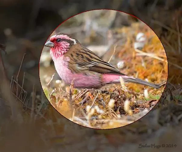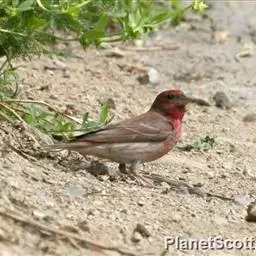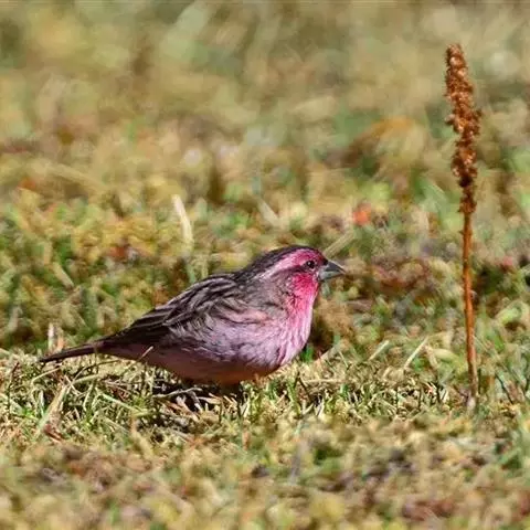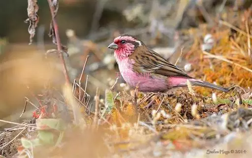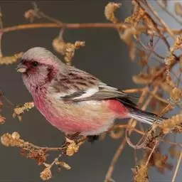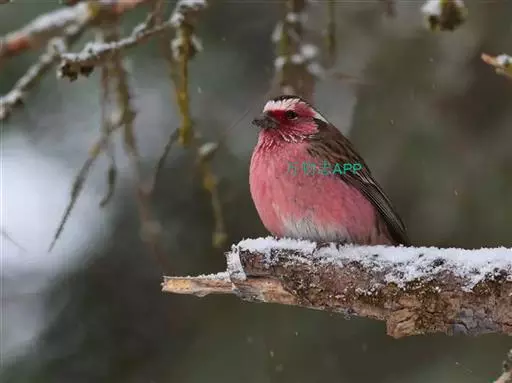 喜马拉雅白眉朱雀(学名:Carpodacus thura):小型鸟类,体长15-17厘米,体重24-35克。额基、眼先深红色,前额和一条长而宽阔的眉纹珠白色沾有粉红色并具丝娟光泽,在暗色的头部极为醒目。头顶至背棕褐或红褐色、具黑褐色羽干纹,腰紫粉红色或玫瑰红色。头侧、颊和下体玫瑰红色或紫粉红色,喉和上胸具细的珠白色,腹中央白色。