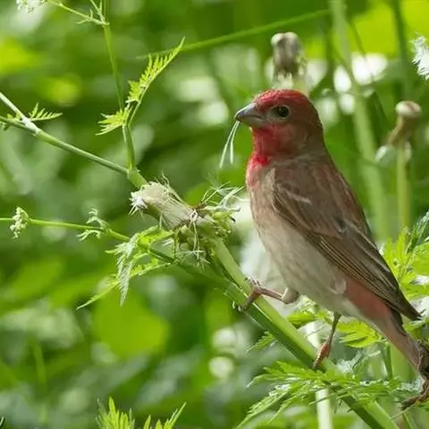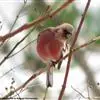 红腰朱雀:体长12-14厘米,小型鸟类。雄鸟前额和眉纹玫瑰粉红色,头顶和一宽的贯眼带深红褐色,背红…