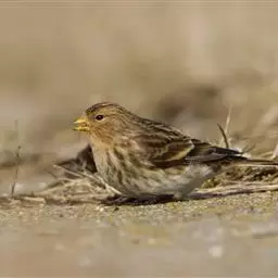 雌鸟前额白色杂有黑色,头顶至背橄榄褐或棕褐色、具宽的黑褐色纵纹,眉纹皮黄白色。腰和尾上覆羽棕黄或金黄色、具细的暗褐色羽干纹,两翅和尾黑褐色,外翈羽缘色淡但无玫瑰色沾染。下体皮黄白色或污白色、密被黑褐色羽干纹。