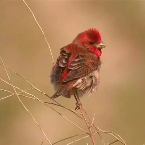 酒红朱雀小型鸟类,体长13~15厘米。雄鸟通体深红色,头部深朱红或棕红色,下背和腰玫瑰红色,…