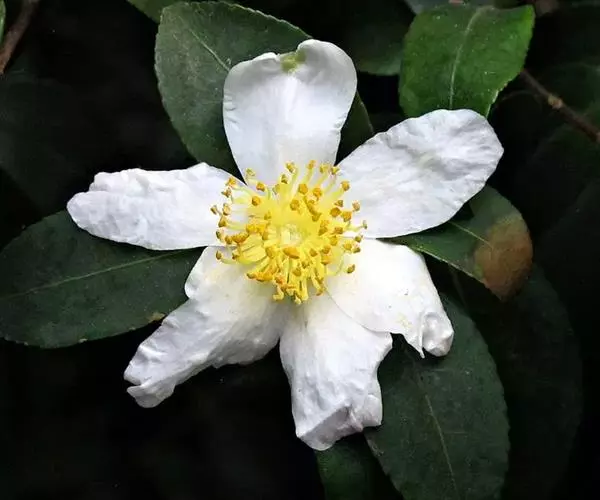 凹脉金花茶,是山茶科山茶属的灌木;嫩枝有短粗毛,老枝变秃;叶革质,椭圆形,先端急尖,…