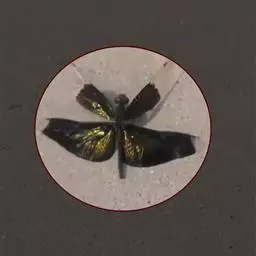 鲜绿色,半透明,扁而宽,背面观几乎呈菱形。头部突出,光滑,但有侧脊。没有发现褐色蛹。中胸有1个明显的绿色背角。第2—5腹节沿气门线强烈向两侧扩张。第5—7腹节有瘤突。从中胸背角顶端到腹末的背面有1条宽的黄色纵带。体长39.7—40.1 mm。