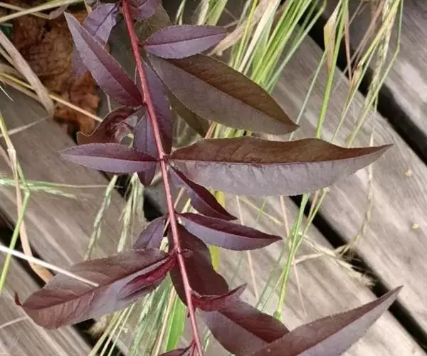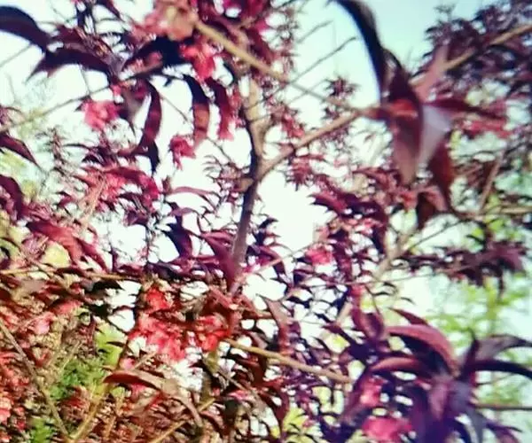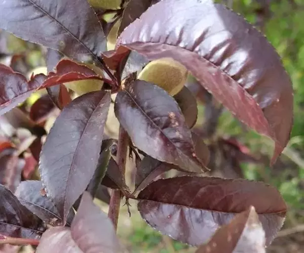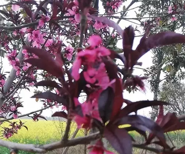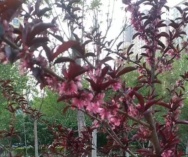 紫叶桃花(学名:Amygdalus persica L. var. persica f. atropurpu-rea Schneid.)是李亚科,桃属植物桃的变种,叶为窄椭圆形至披针形,长15厘米,宽4厘米,先端成长而细的尖端,边缘有细齿,暗绿色有光泽,叶基具有蜜腺;树皮暗灰色,随年龄增长出现裂缝;花单生,从淡至深粉红或红色,有时为白色,有短柄,直径4厘米,早春开花;近球形核果,表面有毛茸,肉质可食,为橙黄色泛红色,直径7.5厘米,有带深麻点和沟纹的核,内含白色种子。