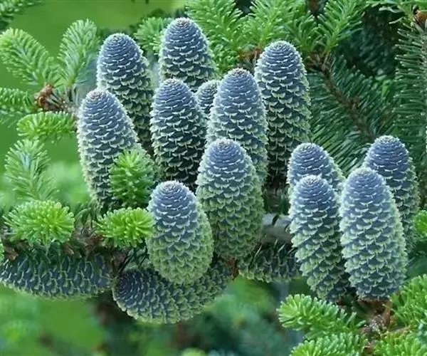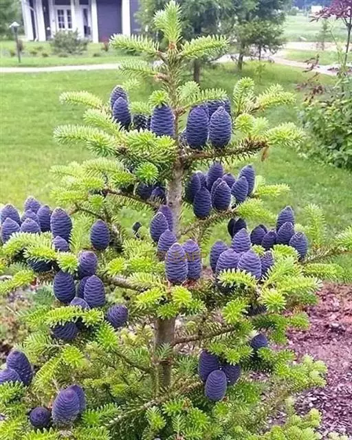 球果卵状圆柱形或短圆柱形,基部稍宽,顶端圆或微凹,有短梗,熟时暗黑色或淡蓝黑色,微被白粉,长6-11厘米,径3-4.5厘米;中部种鳞扇状四边形,长1.4-2厘米,宽1.6-2.4厘米,上部宽厚,边缘内曲,下部两侧耳状,基部窄成短柄状;苞鳞微露出,长1.2-1.8厘米,上端宽圆,边缘有细缺齿,中央有急尖的尖头,尖头通常向后反曲;种子长椭圆形,较种翅长或近等长,种翅黑褐色,楔形,上端截形,连同种子长1.3-1.9厘米。花期5月,球果10月成熟。