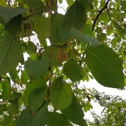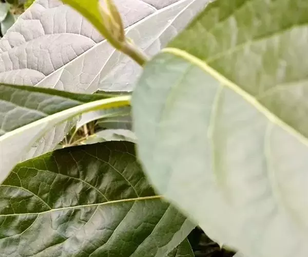 叶椭圆形、卵形或矩圆形,薄革质,长6-15厘米,宽3.5-6.5厘米。基部圆形或阔楔形,先端渐尖;上面暗绿色,初时有褐色柔毛,不久变秃净,老叶略有皱纹,下面淡绿,初时有褐毛,以后仅在脉上有毛。侧脉6-9对,与网脉在上面下陷,在下面稍突起,边缘有锯齿,叶柄长1-2厘米,上面有槽,被散生长毛。