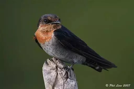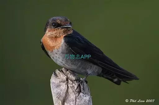 洋燕(图7) 繁殖期3-7月。巢呈杯形,由泥团黏附于建筑物的屋檐下、窗台或门廊,探出的岩崖,码头,桥梁,山洞,地下管道,隧道等。巢用细根,地衣,干草和羽毛衬里。鸟巢往往需要重复使用,如果到下个产卵季节时。筑巢时雌雄亲鸟轮流从江河、湖泊、沼泽、水田、池塘等水域岸边衔取泥、麻、线和枯草茎、草根,再混以唾液,形成小泥丸,然后再用嘴从巢的基部逐渐向上整齐而紧密地堆砌在一起,形成一个非常坚固的外壳。