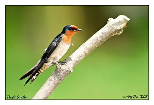 洋燕(学名:Hirundo tahitica)为燕科燕属的鸟类,体长约13厘米。喙短而宽扁,基部宽大,呈倒三角形,上喙近先端有一缺刻;口裂极深,嘴须不发达。翅狭长而尖,尾呈叉状,形成“燕尾”,脚短而细弱,趾三前一后。体型略小。上体钢蓝色,前额栗色。与家燕的区别在下体污白,尾不如其长且无延长,无深蓝色胸带,体型略小,外观也不如家燕漂亮。