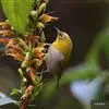 灰腹绣眼鸟 灰腹绣眼鸟(学名:Zosterops palpebrosus;英文名:Oriental White-eye)体长11厘米呈,橄榄绿色,似暗绿绣眼鸟,但区别为沿腹中心向下具一道狭窄的柠檬黄色斑纹,眼先及眼区黑色,白色的眼圈较窄。虹膜黄褐;嘴黑色;脚橄榄灰。喜原始林及次生植被。形成大群,与其他鸟类如山椒鸟等随意混群,在最高树木的顶层活动。分布于印度至中国南方、东南亚及巽他群岛。