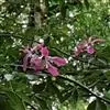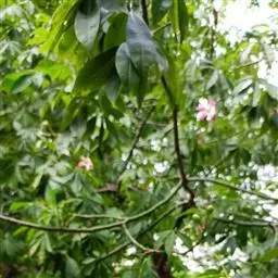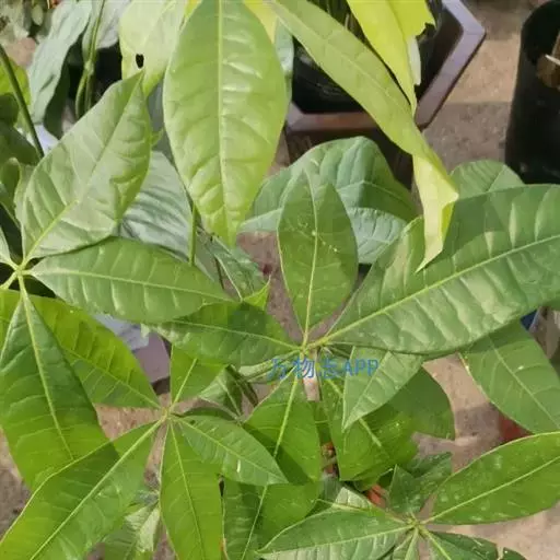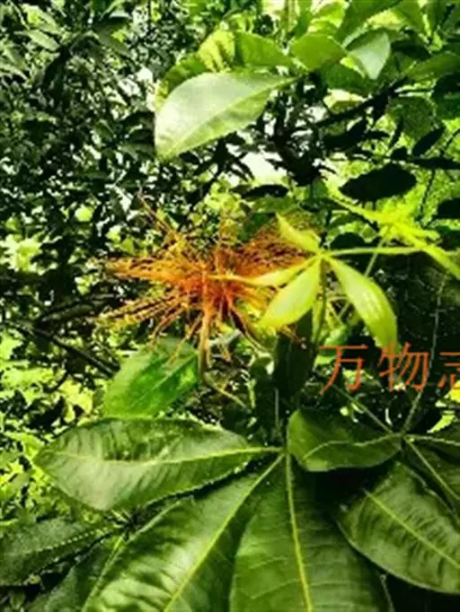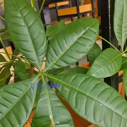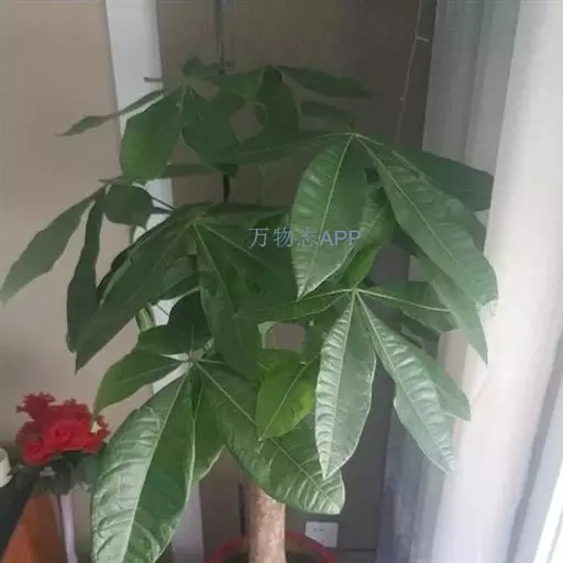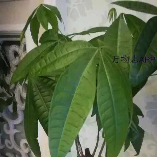 瓜栗(学名:Pachira macrocarpa (Cham. et Schlecht.) Walp. ),俗称发财树,木棉科小乔木,高4-5米,树冠较松散,幼枝栗褐色,无毛。小叶具短柄或近无柄。花单生枝顶叶腋;花梗粗壮,被黄色星状茸毛,脱落;萼杯状,近革质;花瓣淡黄绿色,狭披针形至线形,上半部反卷;雄蕊管较短,花丝连雄蕊管长13-15厘米,下部黄色,向上变红色,花药狭线形,弧曲;花柱长于雄蕊,深红色。蒴果近梨形,果皮厚,木质,几黄褐色,外面无毛,内面密被长绵毛,开裂,每室种子多数。种子大,不规则的梯状楔形,表皮暗褐色,有白色螺纹,内含多胚。花期5-11月,果先后成熟,种子落地后自然萌发。