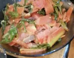 原料:牛腩、牛肚、牛肠各150克、蒜、姜各10克、干辣椒5克、蒜苗15克;