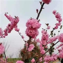 属于观赏桃花类的半重瓣及重瓣品种,统称为碧桃。华东地区碧桃花期是3月~4月,花朵丰腴,色彩鲜艳丰富,花型多。常见的品种有红花绿叶碧桃、红花红叶碧桃,白红双色洒金碧桃等多个变种。碧桃具有很高的观赏价值,在小区、公园、街道随处可见的美丽植物。