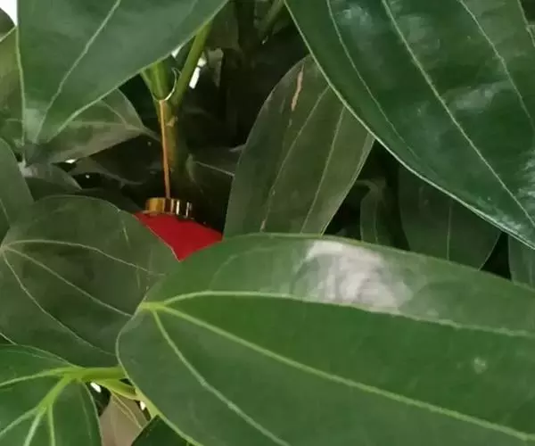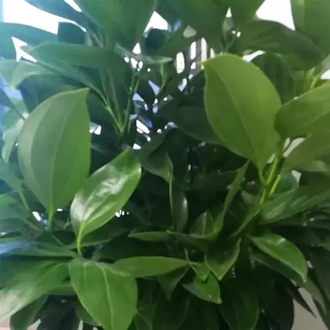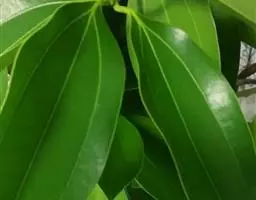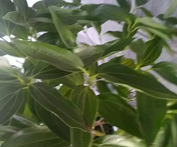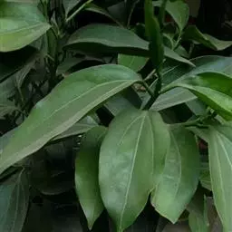 顶芽小,长约3毫米,芽鳞宽卵形,先端渐尖,密被灰黄色短绒毛。叶互生或近对生,长椭圆形至近披针形,长8-16(34)厘米,宽4-5.5(9.5)厘米,先端稍急尖,基部急尖,革质,边缘软骨质,内卷,上面绿色,有光泽,无毛,下面淡绿色,晦暗,疏被黄色短绒毛,离基三出脉,侧脉近对生,自叶基5-10毫米处生出,稍弯向上伸至叶端之下方渐消失,与中脉在上面明显凹陷,下面十分凸起,向叶缘一侧有多数支脉,支脉在叶缘之内拱形连结,横脉波状,近平行,相距3-4毫米,上面不明显,下面凸起,其间由小脉连接,小脉在下面明显可见;叶柄粗壮,长1.2-2厘米,腹面平坦或下部略具槽,被黄色短绒毛。