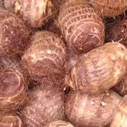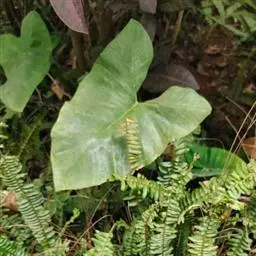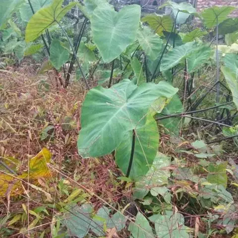 块茎粗厚,可食;侧生小球茎若干枚,倒卵形,多少具柄,表面生褐色须根,亦可食。叶1-5,由块茎顶部抽出,高1-1.2米;叶柄圆柱形,向上渐细,紫褐色;叶片盾状,卵状箭形,深绿色,基部具弯缺,侧脉粗壮,边缘波状,长40-50厘米,宽25-30厘米。