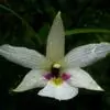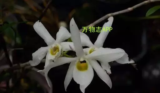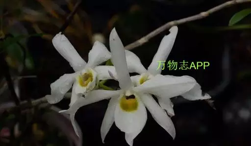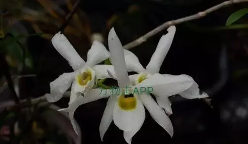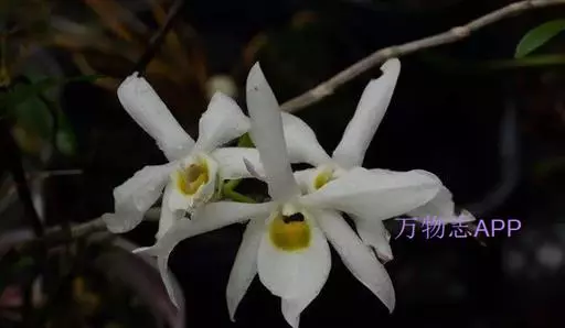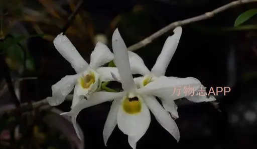 广东石斛(学名:Dendrobium wilsonii Rolfe ):茎直立或斜立,细圆柱形,不分枝,具少数至多数节。叶革质,二列、数枚,互生于茎的上部,狭长圆形。总状花序1-4个,从落了叶的老茎上部发出,具1-2朵花;花大,乳白色,有时带淡红色,开展;花瓣近椭圆形,长2.5-4厘米,宽1-1.5厘米,先端锐尖,具5-6条主脉和许多支脉;唇瓣卵状披针形,比萼片稍短而宽得多,3裂或不明显3裂,基部楔形,其中央具1个胼胝体。花期5月。
