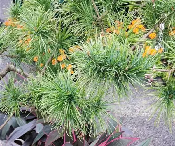由于长期栽培育种五针松中已育出30余个变种和品种。其中大阪松较为 五针松 特殊,属复芽类型,包含金叶与银叶两个变种。