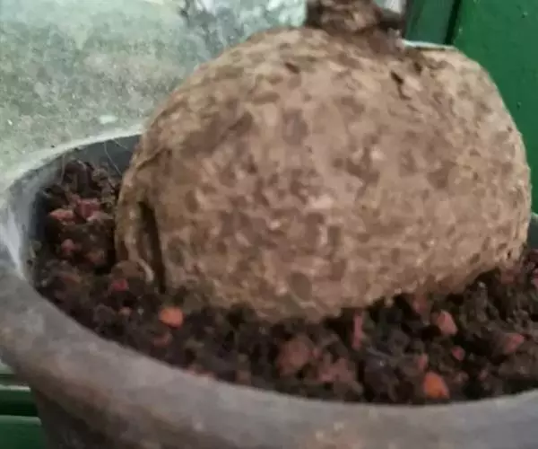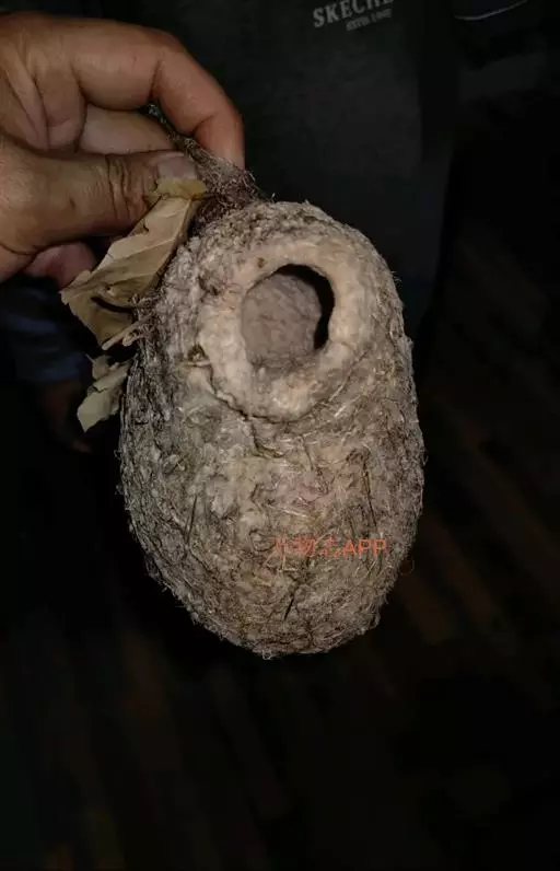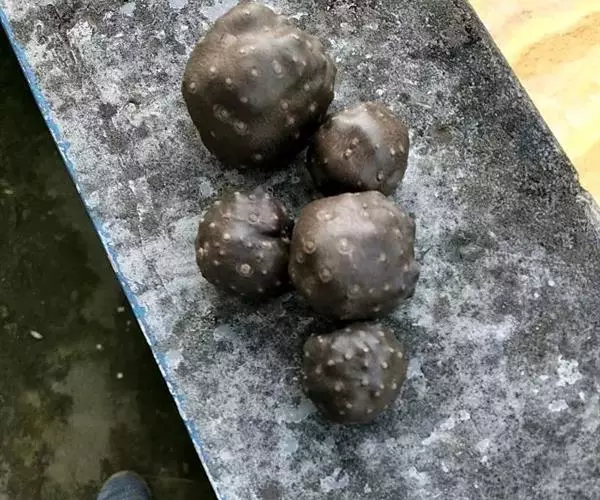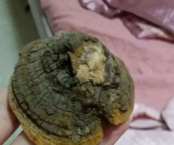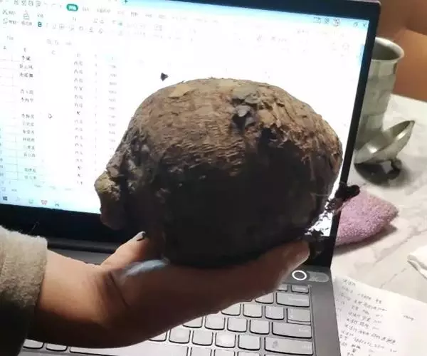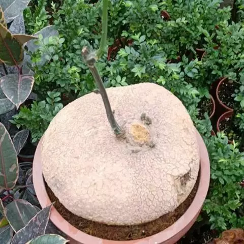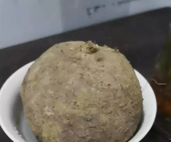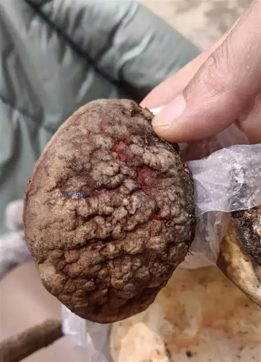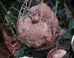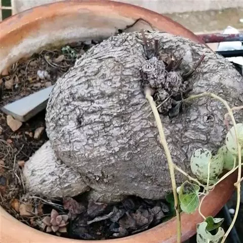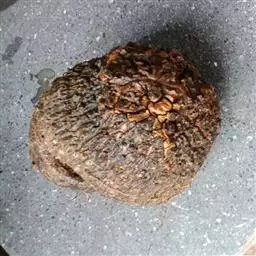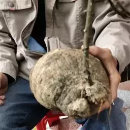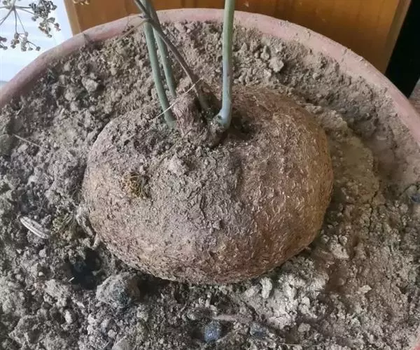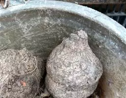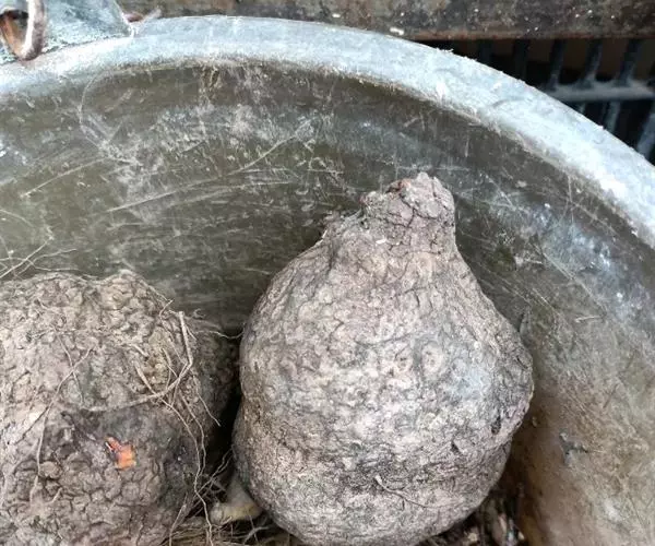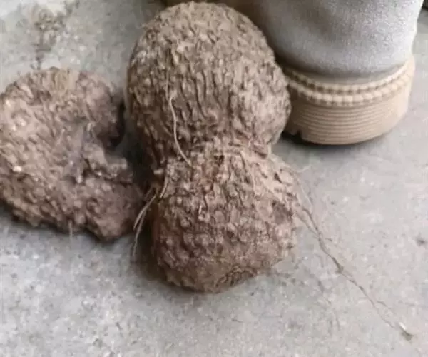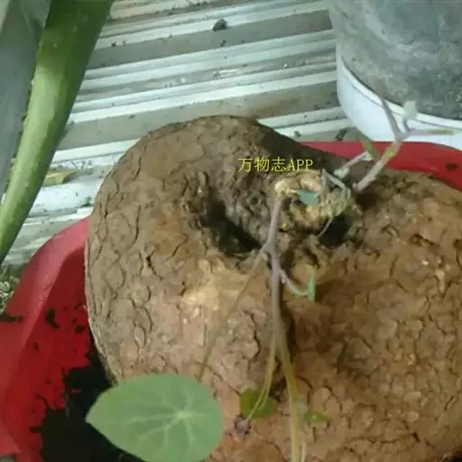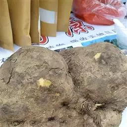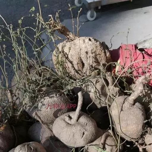 药材性状:块根略呈扁球形或球形,直径6-13cm,顶端微凹陷,残留茎基直径5-7cm。表面深棕色,粗糙,有纵向突起的皮孔,长1-3mm。商品多为类圆形的横切块片,直径3-7cm,厚2-5mm,略卷曲,切面可见维管束(三生构造)排列成3-4个同心环。气微,味苦。