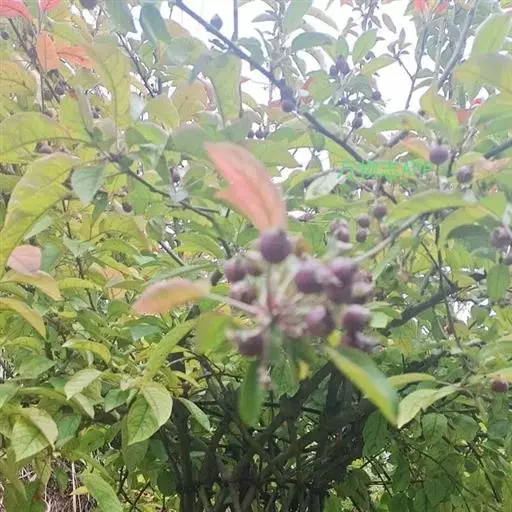果肾形或近肾形,长7~10毫米,径4~6毫米,深蓝黑色,成熟时呈红黑色,被白粉;果梗长0~5毫米。花期5~7月,果期7月至翌年5月。