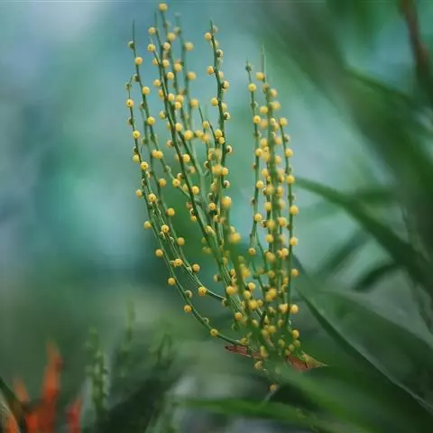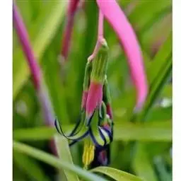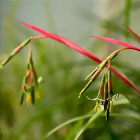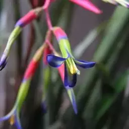 花两性,少单性,辐射对称或稍两侧对称,花序为顶生的穗状花序;苞片常显著而具鲜艳的色彩,鸟媒、虫媒和蝙蝠媒,很少为风媒或闭花受精;萼片3枚,覆瓦状排列;花瓣3枚,覆瓦状排列,常在基部有一对鳞片状的附属物;雄蕊6枚;花柱细长。开花时内轮叶的下半部或全叶片变成鲜红色。小花蓝紫色。隐藏于叶筒中。