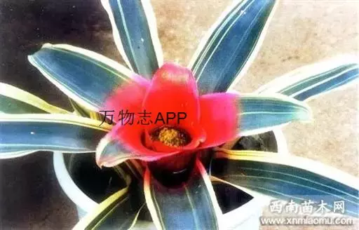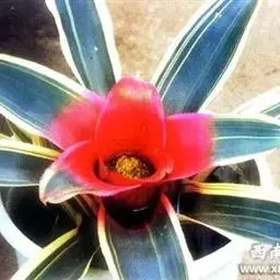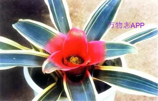 彩叶凤梨(Neoregelia carolinae (Beer) L.B.Sm.) 凤梨科多年生常绿草本。株高25-30厘米,茎短。叶革质,带状,常基生,莲座式排列,叶缘有锯齿。花两性,少单性,辐射对称或稍两侧对称,花序为顶生的穗状花序。叶中央有乳白至乳黄色纵纹,基部丛生成筒状。开花时内轮叶的下半部或全叶片变成鲜红色。小花蓝紫色。