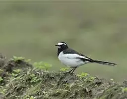 日本鹡鸰:体长约20厘米。上体多黑色,额、颏及眉纹白,下体白,两翼黑而具白色横斑及羽缘,…