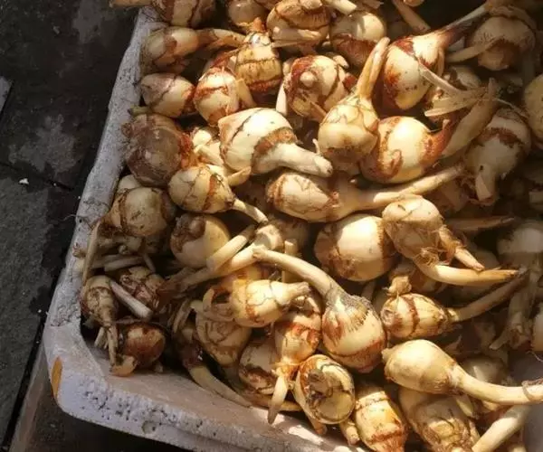 采收时间因地区不同而异。山东一带自秋季初霜后(茎叶枯黄时)到第2年球茎发芽前,即11月至翌年3月,可随时采收,在霜降到大雪期间采收较多,在地上部茎叶刚枯黄时采收产量较低,一般延迟采收产量高。这是因为茎叶刚枯黄时,短缩茎中的养分仍可继续向球茎输送,使球茎继续膨大,从而增加产量。所以,在10月底到11月初排去田水,并割去慈姑叶片,留茬15厘米左右。割叶后每隔2m开沟,沟深30厘米左右,畦面晒干并整细,套种越冬青菜,既可增加慈姑产量,又可在1-2月蔬菜淡季供应上市,提高经济效益。
