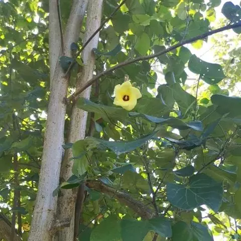 樟叶槿(Hibiscus grewiifolius Hassk)为锦葵科木槿属植物。常绿小乔木,高可达7 m。叶纸质至近革质,卵状长圆形至椭圆状长圆形,先端短急尖,基部钝至阔楔形,两面均平滑无毛,上面暗绿色,下面苍绿色。花硕大,黄色,全年不定时开花。果单生于上部叶腋间。