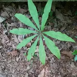 螃蟹七又名紫盔天南星、城口天南星。多年生草本。块茎扁球形,直径3-5cm,常具多数小球茎。鳞叶3,褐色,宽2-2.5cm,向上渐狭,最上的长约15cm。叶柄长20-40cm,粗6-7mm,下部1/4具鞘;叶片3深裂至3全裂,裂片全缘,中裂片近菱形,卵状长圆形至卵形,长17-32cm,宽15-25cm;侧裂片斜椭圆形,长9-23cm,宽6-16cm;中肋背面隆起,侧脉9-10对,集合脉距边缘约5mm。花序柄比叶柄短而细,长18-26cm。佛焰苞紫色,有苍白色线状条纹,管部近圆柱形,长4-8cm,直径1.5-2cm,喉部边缘耳状反卷;檐部长圆三角形,拱形下弯或近直立,长6-12cm,宽4-4.5cm,长渐尖,具长1-4cm的尾尖。肉穗花序单性,雄花序长2.5-3cm,圆柱形,粗4-5mm,雄花有花药2-4,药室卵圆形,基部叉开,顶孔开裂;雌花序长约2cm,子房具棱,顶部常圆形,花柱极短而粗,柱头有毛;附属器粗壮,圆锥状,长约4.5-9cm,基部骤狭成短柄,上部长渐尖,先端钝,粗1.5-5mm,近直立或上部略弯。花期5-6月。