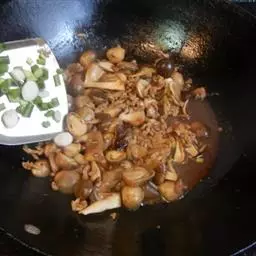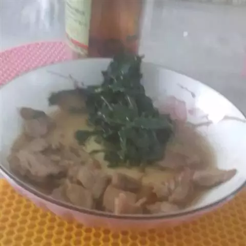 5.汤汁烧开后, 把牛肉 片放入锅中, 再放进蒜苗、盐、味精,水再次烧开后即可倒在生菜上。