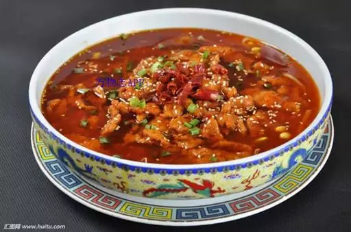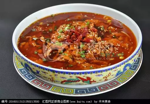 特色传统名菜,属川菜系。主料瘦黄牛肉。辅料豆芽、鸭血、肉汤、莴笋或者其他蔬菜、粉丝。调料葱、精盐、酱油、花椒、味精、熟菜油、干辣椒、辣椒油、胡椒粉、醪糟汁、湿淀粉、郫县豆瓣酱。因菜中牛肉片是在辣味汤中烫熟,故名水煮牛肉。
