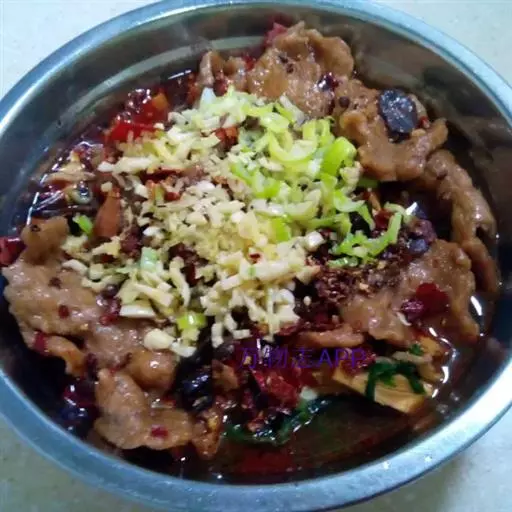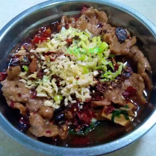 今天的水煮牛肉,已经不是简单的清水加花椒了。是将牛肉切成一寸五分长、八分宽、一分厚的薄片,盛在碗里,加精盐、酱油、醪糟汁、湿 淀 粉拌匀。油锅中放郫县豆瓣、干辣椒炒成棕黄色,再下花椒、葱段、莴笋片炒香,加肉汤烧开,将牛肉片下锅,煮至肉片伸展,外表发亮,盛入碗中,淋上辣椒油,即可食用。这菜的特点是麻辣味厚,滑嫩适口,具有火锅风味。若以猪肉作原料,便叫水煮肉片。