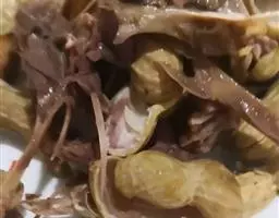 5、将煮熟的牛肉片铺在豆芽上,并倒入适量汤汁,铺上花生碎、芝麻、蒜末、干辣椒面;
