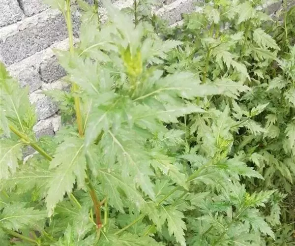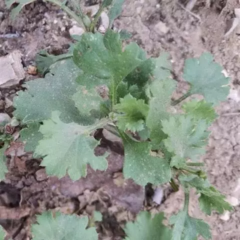 基生叶和下部叶花期脱落。中部茎叶卵形、长卵形或椭圆状卵形,长3-7(10)厘米,宽2-4(7)厘米,羽状半裂、浅裂或分裂不明显而边缘有浅锯齿。基部截形或稍心形或宽楔形,叶柄长1-2厘米,柄基无耳或有分裂的叶耳。两面同色或几同色,淡绿色,或干后两面成橄榄色,有稀疏的短柔毛,或下面的毛稍多。