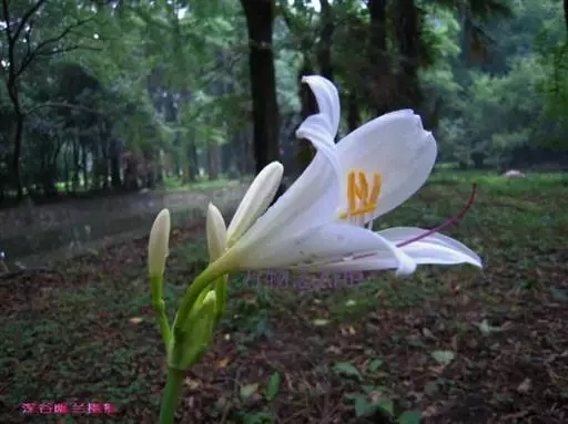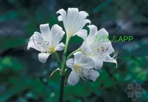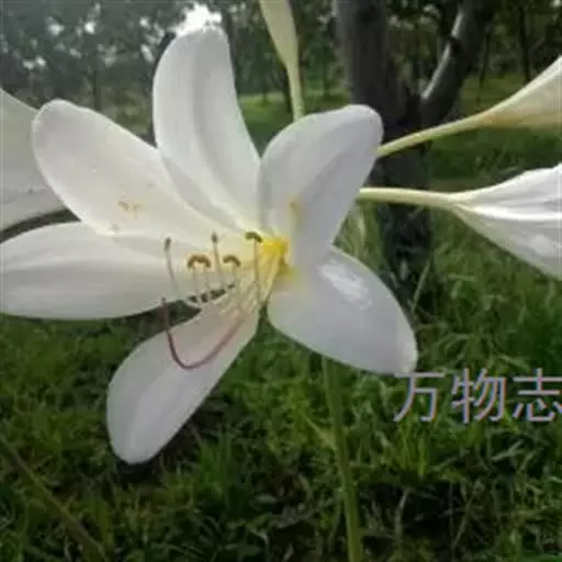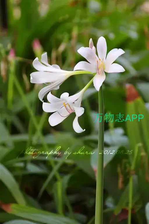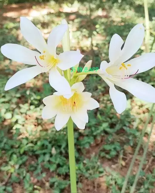 长筒石蒜草本,地生。鳞茎卵球形;叶披针形;伞形花序,有花5-7朵,花白色;花被裂片腹面稍有淡红色条纹,…