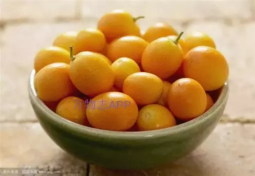 金橘 韩彦直。《桔谱》:“金柑(橘)出江西,北人不识。景佑中始主汴都,因温成皇后嗜之,价遂贵重。”