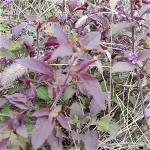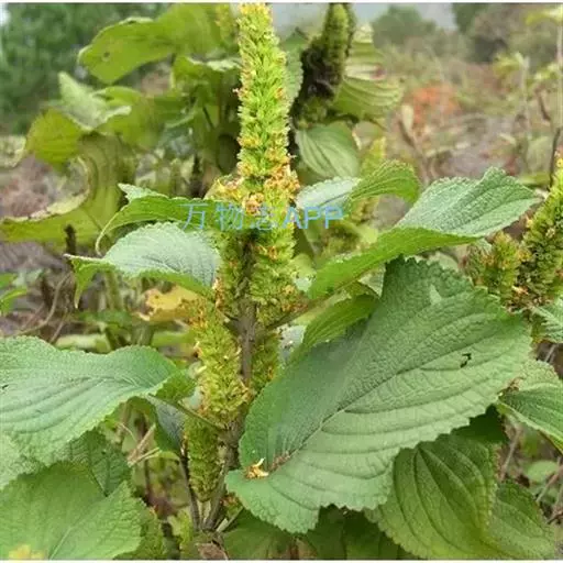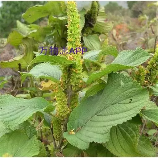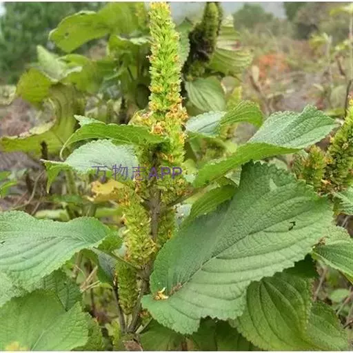 茎呈方柱形,长15-40cm,常从基部分枝,表面紫红色,被短柔毛;质脆。叶多卷曲皱缩,展平后呈长圆形或卵状长圆形,长0.8-4cm,宽0.3-1.5cm,上面黄绿色,被柔毛;叶柄长0.1-1cm,密被柔毛。顶端常有假穗状花序,花黄棕色。气清香,味辛凉。