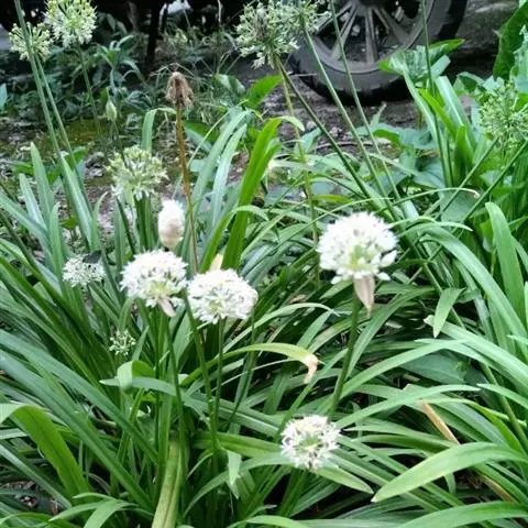 鳞茎圆柱状,具粗壮的根;鳞茎外皮白色,膜质,不破裂。叶条形至宽条形,稀为倒披针状条形,比花葶短或近等长,宽5-10(-28)毫米,具明显的中脉。花葶侧生,圆柱状,或略呈三棱柱状,高(10-) 20-60厘米,下部被叶鞘;总苞2裂,常早落;伞形花序近球状,多花,花较密集;小花梗纤细,近等长,为花被片的2-3(-4)倍长,基部无小苞片;花白色,星芒状开展;花被片等长,披针形至条形,长4-7.5毫米,宽1-1.2毫米;先端渐尖或不等的2裂;花丝等长,比花被片短或近等长,在最基部合生并与花被片贴生;子房倒卵形,基部收狭成短柄,外壁平滑,每室1胚珠;花柱比子房长;柱头点状。花果期8-19月。