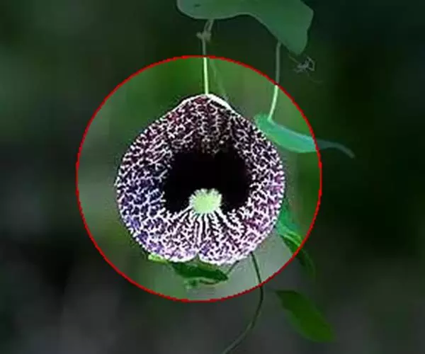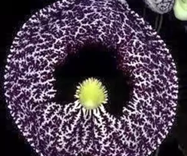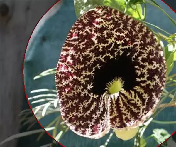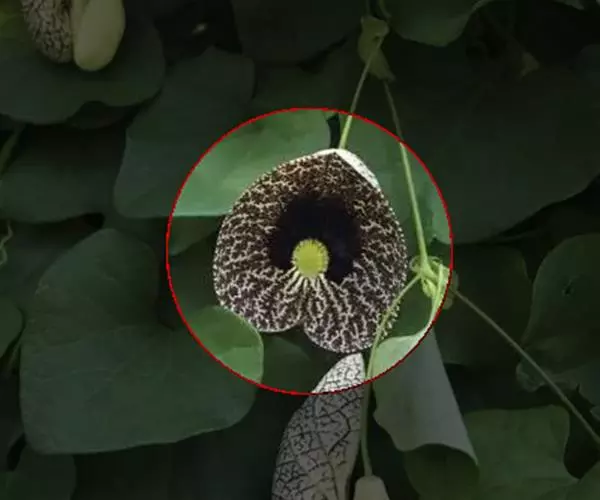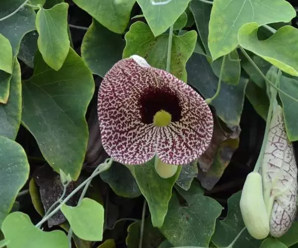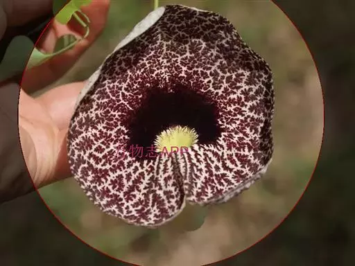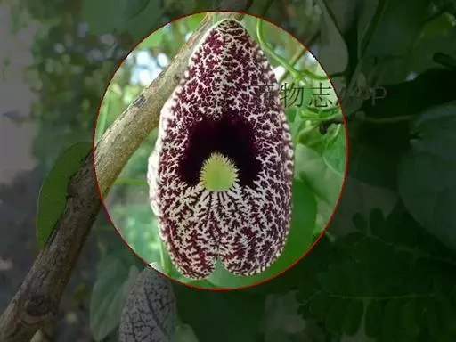 美丽马兜铃开花照 花单生于叶腋,花柄下垂长10~12厘米,先端着一花;花被合生,向上弯曲,呈喇叭状;未开放前为一气囊,形似饺子,长10厘米,宽4厘米,有紫褐色脉纹,花被筒基部膨大,中部细,上部扩大成喇叭形,黄绿色;全朵自下而上呈“S”形弯曲,造型奇特,十分别致。开花时沿中缝裂开,呈长椭圆形,内满布深紫色斑点,喇叭口处有一半月形紫色斑块,很是显眼。子房下位,蒴果长圆柱形,成熟时黑褐色,6个心皮由花柄处裂开,将花柄一分为二,呈吊篮状悬挂在空中,甚是好看。种子深褐色,呈等腰三角形,有膜翅。开花时发出浓烈臭味,引得蚂蚁等昆虫前来为其授粉。花期5~9月,果期6~10月。
