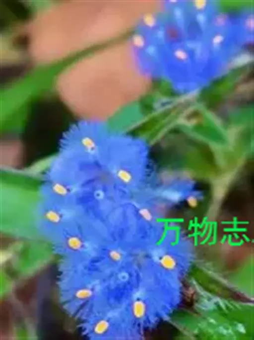 多年生披散草本,全体密被长硬毛,有的为蛛丝状毛,有的近无毛,基部有球状而被毛的鳞茎,鳞茎直径约1厘米。茎通常自基部多分枝,或上部分枝,或少分枝,长10-60厘米。叶线形至披针形,长5-10(15)厘米,宽0.3-1 (1.5)厘米。蝎尾状聚伞花序顶生,并兼腋生,单生,少有在顶端数个聚生成头状,具花序梗或无;总苞片较叶宽而短,佛焰苞状,苞片镰刀状弯曲而渐尖,长5-10毫米,宽约3毫米,两列,每列覆瓦状排列;萼片基部连合,长圆状披针形,顶端急尖,长近5毫米,外被白色长硬毛;花瓣蓝色或蓝紫色,长6-8毫米,顶端裂片匙状长圆形;花丝被蓝色绵毛。蒴果倒卵状三棱形,顶端被细长硬毛,长约2.5毫米,直径约3毫米。种子灰褐色,具许多小窝孔。花期7-9月,果期10月。