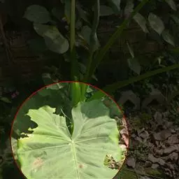 危害症状:由芋疫霉真菌侵染引起,是芋重要的病害之一。危害叶片,也可危害叶柄及球茎。在叶片上初生黄褐色圆形病斑,后扩大融合成圆形或不规则形轮纹斑,湿度大时病斑上有白色霉状物,到后期,病部组织腐败而穿孔,仅留叶脉;叶柄受害,病斑长椭圆形、暗褐色,潮湿时表面有白色稀疏的霉状物。