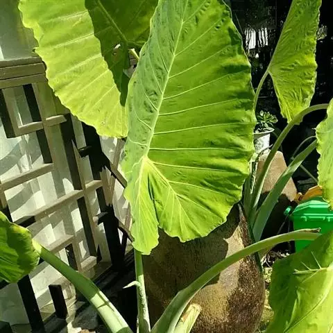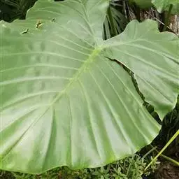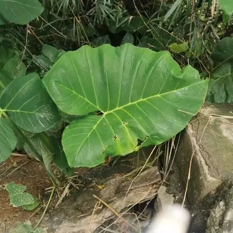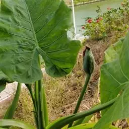 芋(学名:Colocasia esculenta (L) . Schott)是天南星科、芋属植物。湿生草本。块茎通常卵形,常生多数小球茎,均富含淀粉。叶2-3枚或更多。叶柄长于叶片,长20-90厘米,绿色,叶片卵状,长20-50厘米。佛焰苞长短不一,一般为20厘米左右:管部绿色,长约4厘米,粗2.2厘米,长卵形;檐部披针形或椭圆形,长约17厘米,展开成舟状,边缘内卷,淡黄色至绿白色。肉穗花序长约10厘米,短于佛焰苞。花期2-4月(云南)至8-9月(秦岭)。